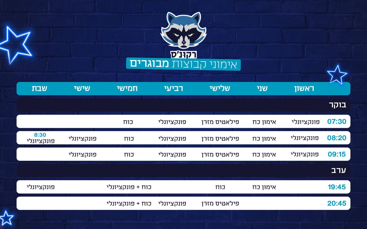 | BODY-HIT | א' ,ג' | 09:15 - 08:15 10:15 - 09:15 |